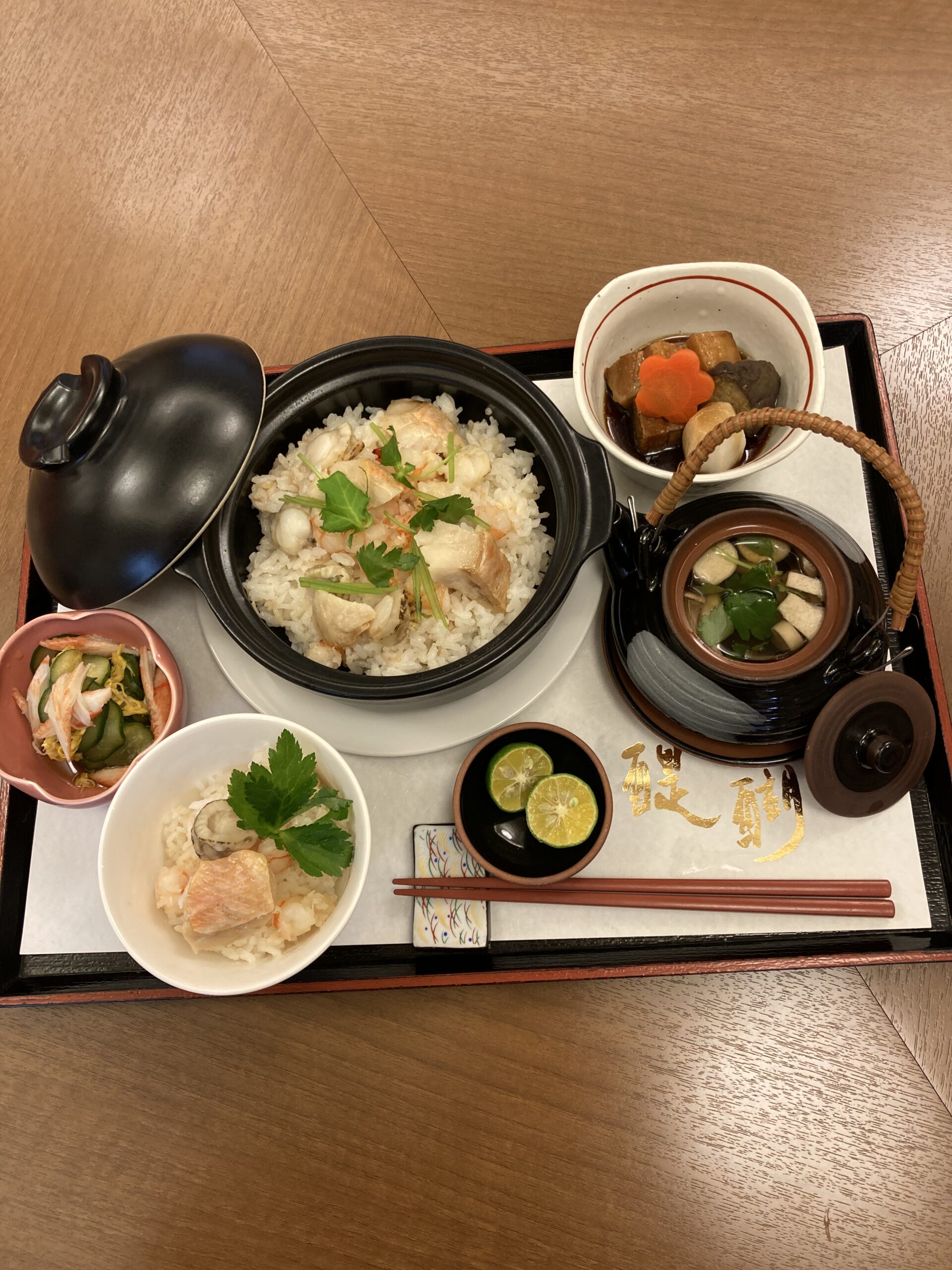 今回は鯛やエビが多く入った土鍋御飯と旬の松茸の土瓶蒸しと豪華なアラカルトでした。